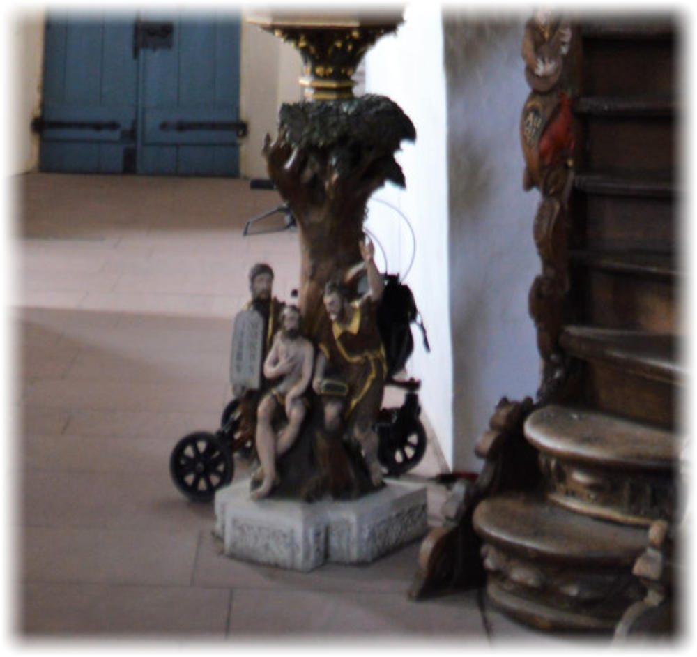 Der Kanzelfuß ist als Baumstamm gestaltet und trägt den Kanzelkorb.