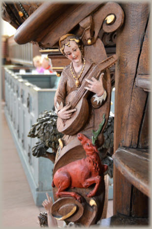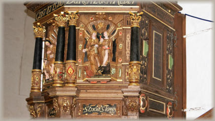 Gotteslamm hin und zeigt auf den Gekreuzigten in der Kalotte unter dem Kanzelkorb. Dem