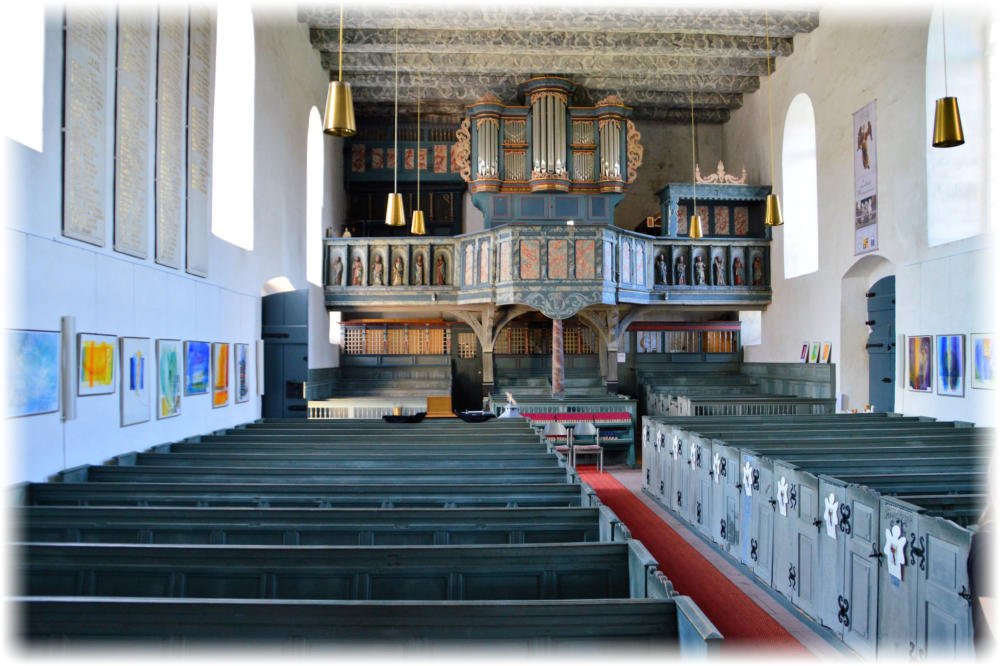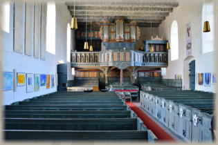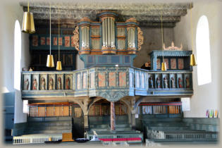 In der Brüstung der Orgelempore sind Holzplastiken eingearbeitet. Diese Apostelfiguren stammen