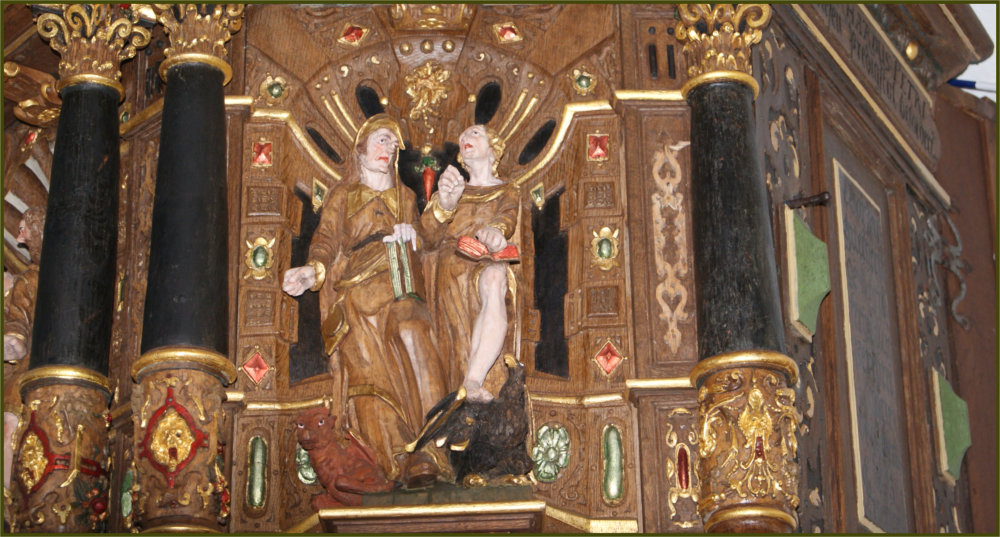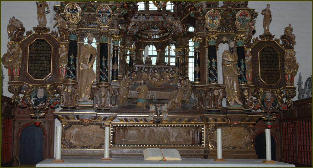 In der mittelalterlichen Kirche gab es vor der Reformation vermutlich mehrere Altäre. Neben dem gotischen Chor mit dem Hochaltar bot das Querschiff mit seinen Apsiden und Wandnischen Platz für zusätzliche Seitenaltäre. Von der vorreformatorischen Ausstattung ist eine Reihe geschnitzter Skulpturen erhalten, die ursprünglich wohl zu einem spätgotischen Altarretabel gehörten und nun in die Brüstung der Westempore eingebaut sind.